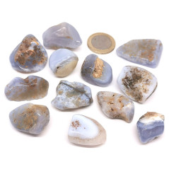 Polie en pierres roulées, elle dévoile un bleu tendre évoquant le calme d’un ciel clair ou la quiétude d’une mer tranquille. Chaque pierre offre des nuances subtiles, parfois laiteuses, parfois translucides, selon sa structure naturelle. Les principaux gisements de calcédoine bleue se situent en Namibie, à Madagascar, au Brésil et en Turquie.